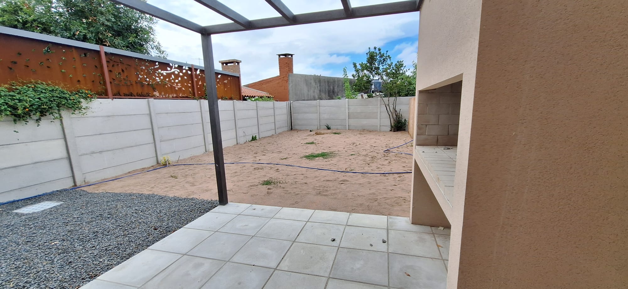Cerramiento perimetral al frente con rejas, portón vehicular y peatonal, Fondo con cerramiento perimetral